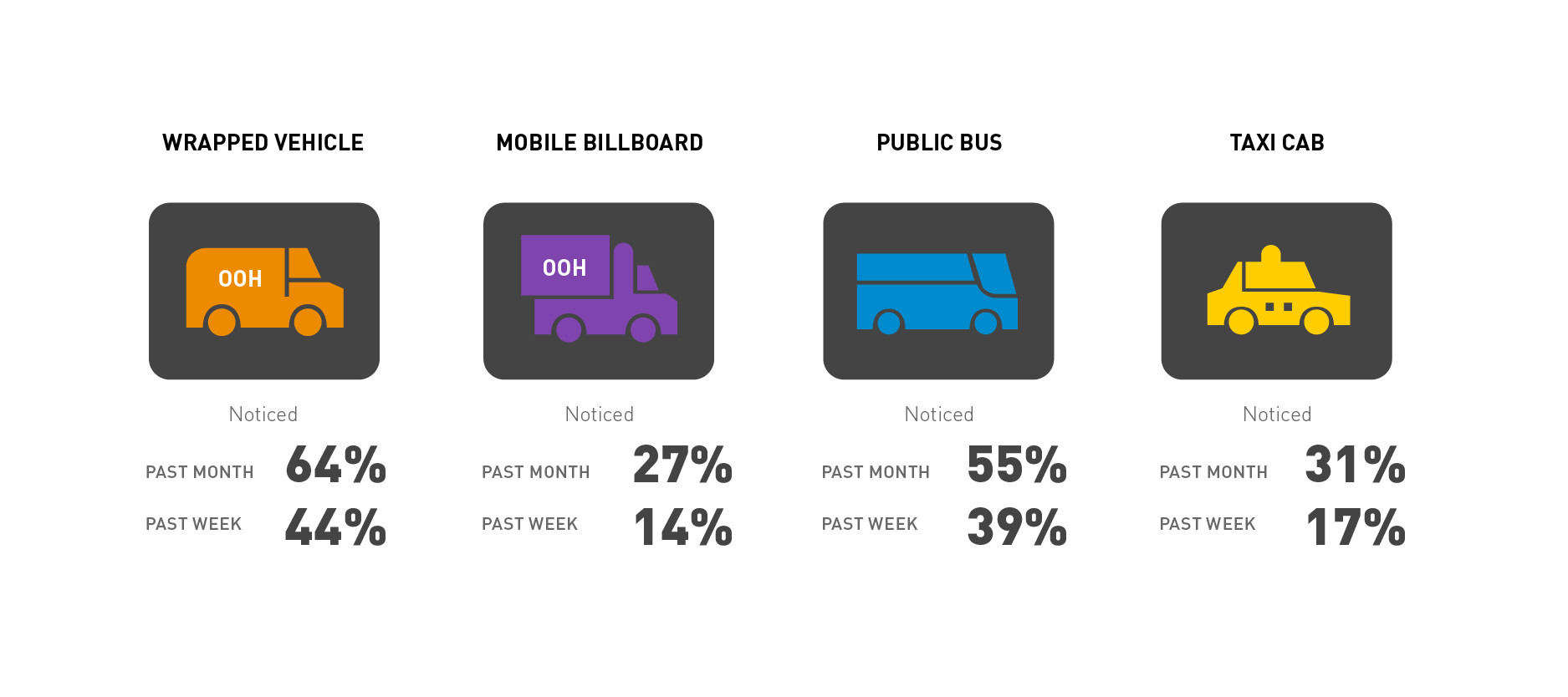 Alta taxa de lembrança publicitária (64% notaram veículos envelopados no último mês, segundo Nielsen & OAAA)